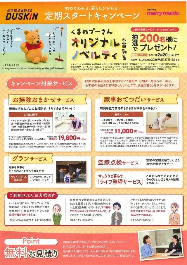 武蔵野・三鷹・杉並にお住まいの方、お掃除関係のみダスキン吉祥寺本町にてお伺いさせていただいております。